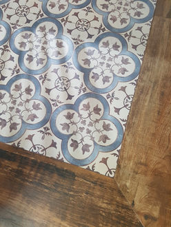 O piso em porcelanato que imita madeira foi instalado de forma tradicional, emoldurando o porcelanato que imita ladrilho hidráulico, dando um toque de fazenda ao ambiente.
