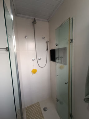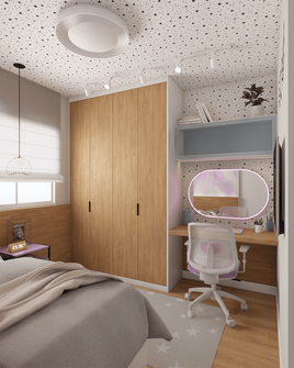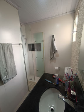 Na suíte master, um ajuste inteligente mudou completamente o uso: parte do armário do quarto da filha foi incorporado ao banheiro do casal. Assim, sem prejuízos ao quarto infantil, conseguimos ampliar o ambiente e incluir duas pias independentes — um detalhe simples, mas que transforma a rotina e evita conflitos.