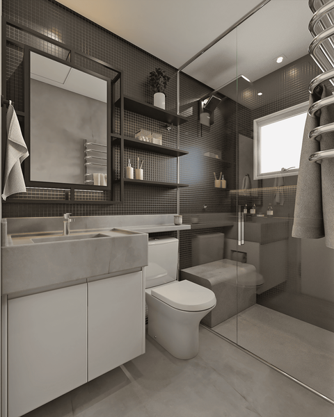 No andar superior, o banheiro da suíte foi pensado para desacelerar. Ele tem um visual mais bruto, com pastilhas pretas, serralheria, cimento queimado e limestone bateig blue. É um ambiente que impõe presença sem deixar de ser acolhedor. O banco dentro do box foi projetado para aqueles momentos de pausa depois de um treino pesado. Um banho ali é quase ritual de recuperação.