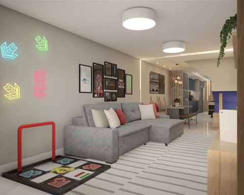 Na sala de estar, o coração gamer pulsa forte. Tem TVzona na parede, som de respeito e espaço pra tudo acontecer. É ali que rolam as partidas de futebol americano na tela, os encontros com amigos, as sessões de Playstation, os desafios no Xbox e até duelos dançantes na plataforma de dança que lembra os fliperamas dos anos 2000. A casa foi pensada para receber, acolher e se divertir de verdade.